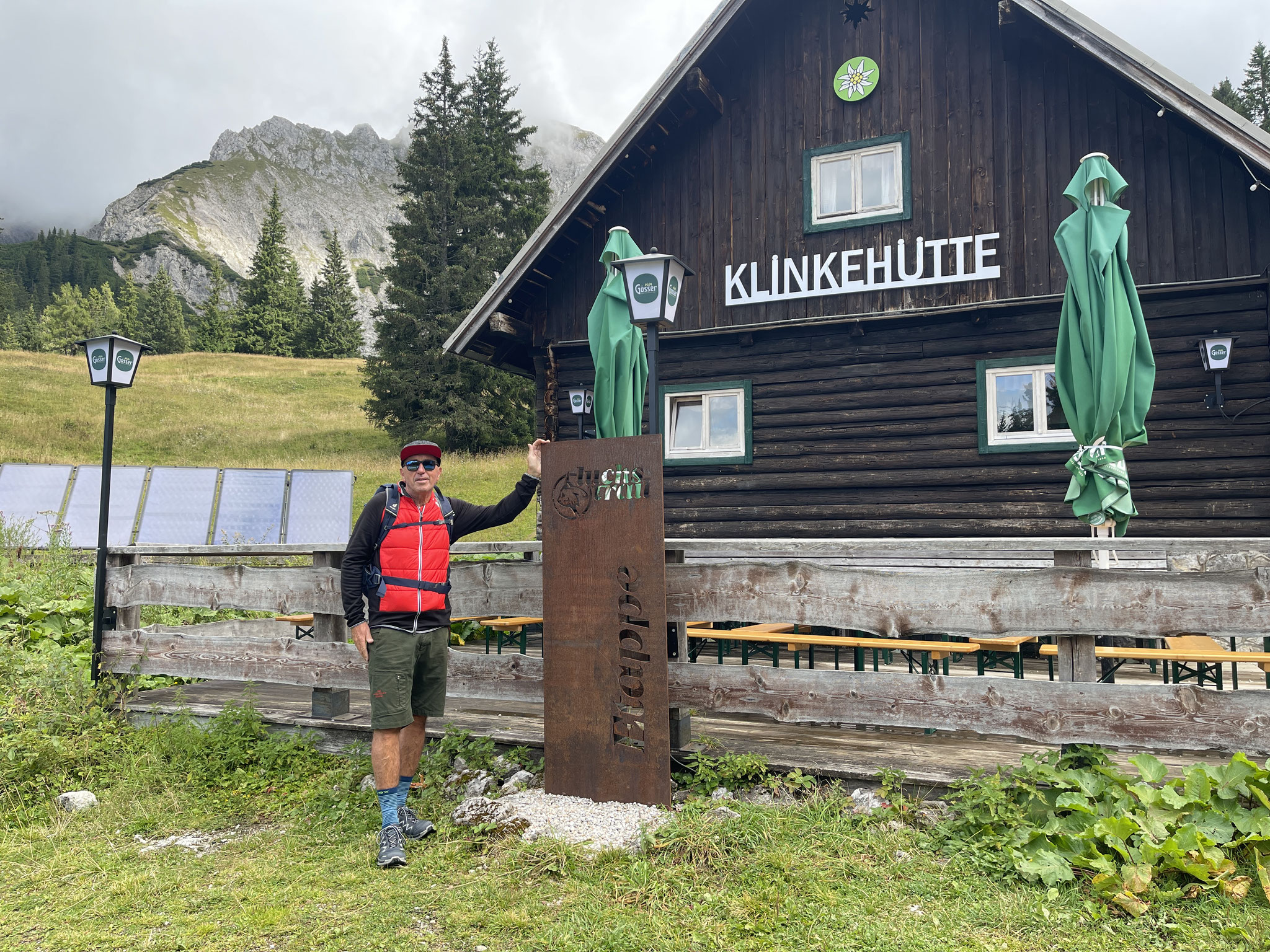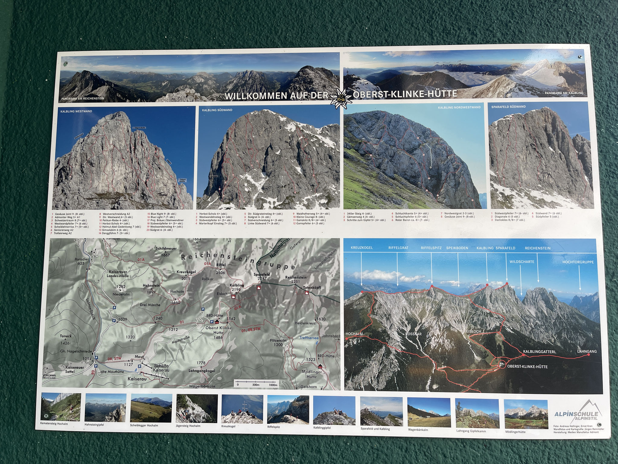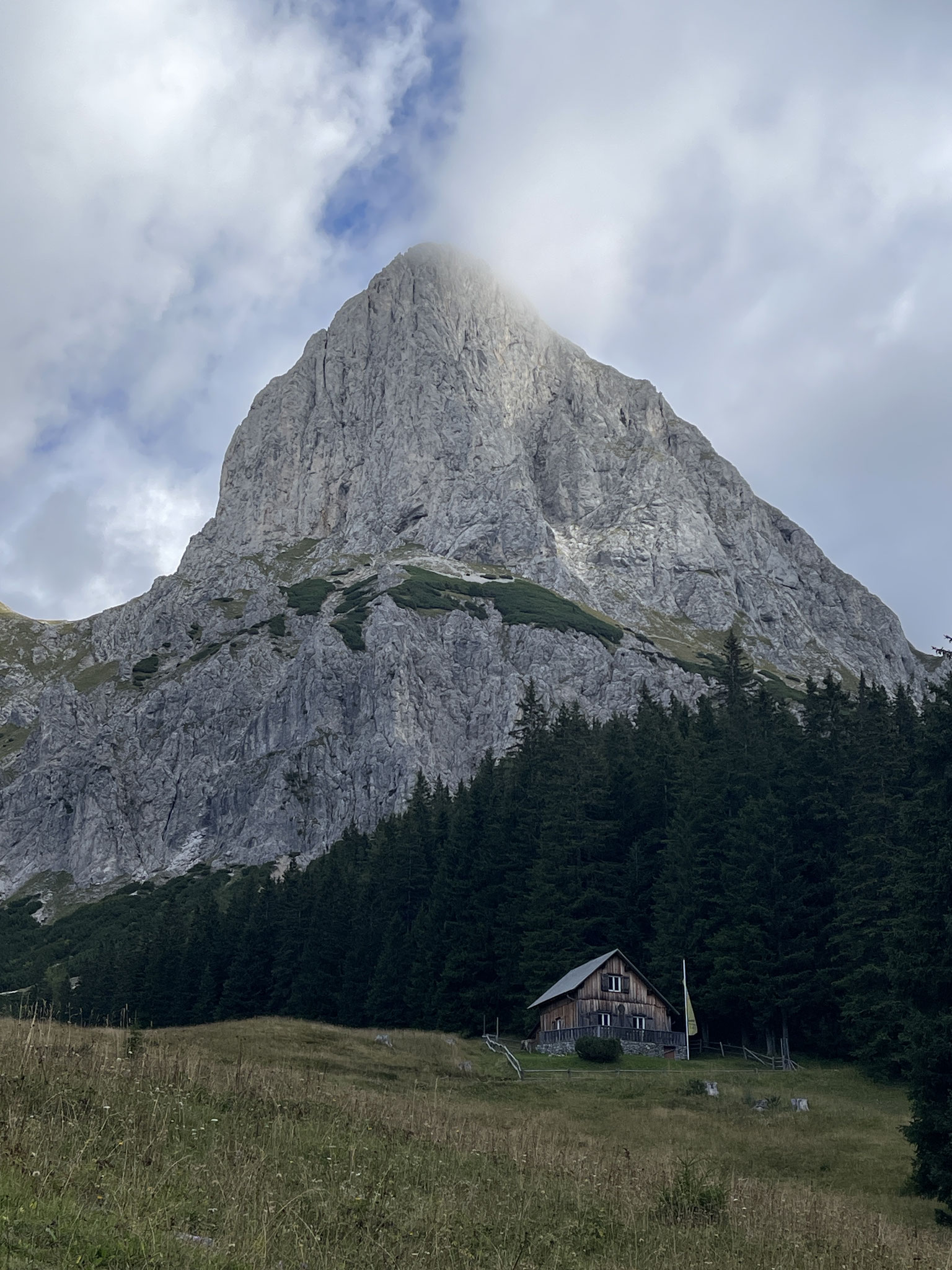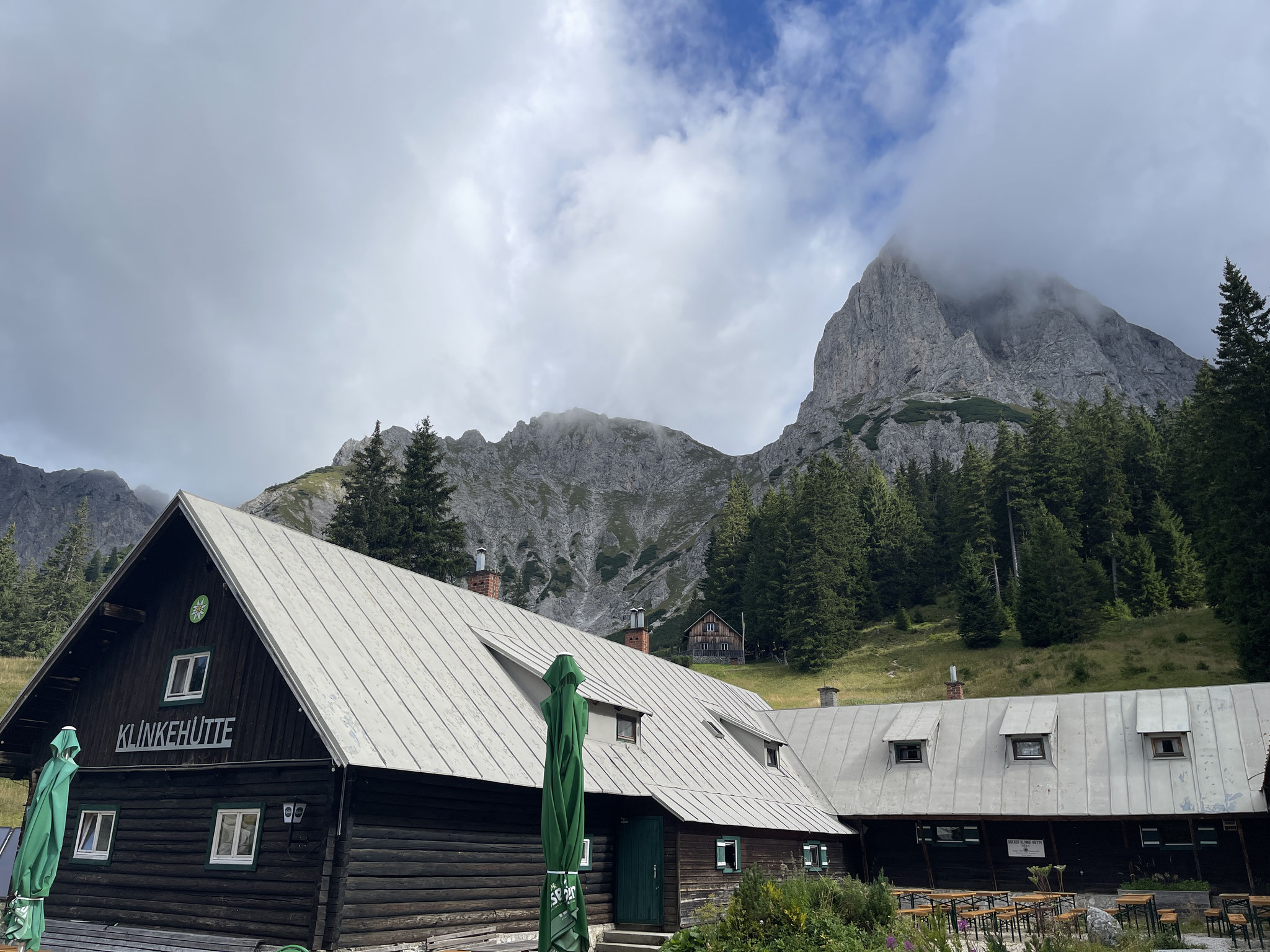Oberst Klinke Hütte am Südfuß der Reichensteingruppe (Westrand des Gesäuses in der Obersteiermark) Oberhalb ragt der Gipfel des Admonter Kaiblings mit seinen West- und Südwänden sowie das Sparafeld in den Himmel. Gesamt ca. 400hm/8 km.